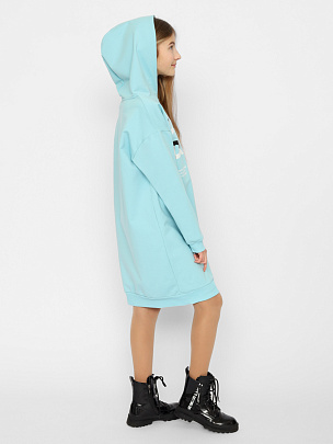 Платье для девочки с длинными рукавами и капюшоном. Рукава с манжетами по низу. Нижние срезы платья обработаны притачным поясом. Пояс и манжеты выполнены из полотна с эластаном. Перед платья декорирован принтом "Давай мечтать".