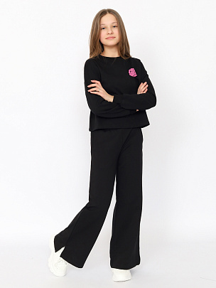 Стильный костюм оверсайз (свободный крой) состоит из 2-х предметов: укороченный свитшот и брюки-палаццо. Свитшот декорирован ярким объемным пафф-принтом "Свободный художник". Брюки-палаццо с завышенной талией и расклешенные снизу. Элементы костюма можно носить как самостоятельные вещи.