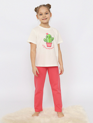 Пижама гладкокрашенная из футболки и брюк. Футболка свободного покроя с коротким рукавом. Горловина обработана притачной бейкой из рибаны с лайкрой. На правом боку принт в виде бабочки. Прямые брюки умеренного объёма выполнены из полотна дополнительного цвета. Цельнокроенный пояс обработан плоским швом вподгибку с одновременным прокладыванием резинки.