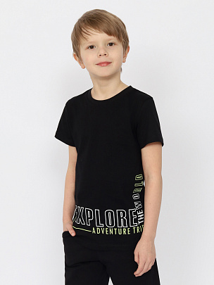 Пижама гладкокрашенная из футболки и брюк. Футболка свободного покроя с коротким рукавом. Горловина обработана притачной бейкой из рибаны с лайкрой. На правом боку принт в виде бабочки. Прямые брюки умеренного объёма выполнены из полотна дополнительного цвета. Цельнокроенный пояс обработан плоским швом вподгибку с одновременным прокладыванием резинки.