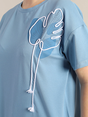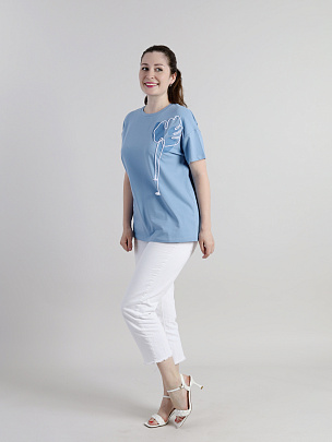 Футболка прямого силуэта длиной по линию бедер. Со спущенными плечами, короткий рукав. Круглая горловина обработана узкой притачной обтачкой из рибаны с эластаном. Полочка декорирована вышивкой шнуром.