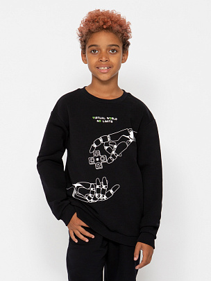 Джемпер с длинным рукавом, притачным поясом (рибана с лайкрой) и застежкой на кнопки в плечевом шве. Горловина круглая, обработана притачной обтачкой из рибаны с лайкрой, по ростку настрочена экстрафорная лента. По низу рукава притачная манжета из рибаны с лайкрой. На полочке выполнена шелкография мягкими красками. Брюки с притачным поясом и манжетами из рибаны с лайкрой. По боковому шву настрочена узкая рюша из отделочного полотна.
