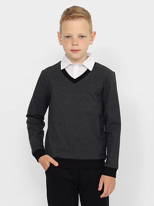 Джемпер с длинным втачным рукавом и манжетами. Манжеты, воротник и пояс выполнены из полотна с добавлением эластана. В горловине расположена эмитация рубашки с отложным воротником и стойкой.