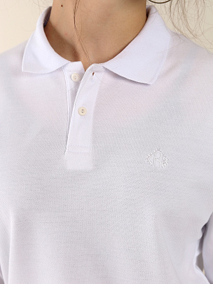 Джемпер-поло из пике для девочки, с длинными объемными рукавами, свободного силуэта, спущенным плечом и отложным воротником. Спереди застежка на пуговицы. Спереди декорирован вышивкой.