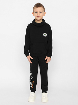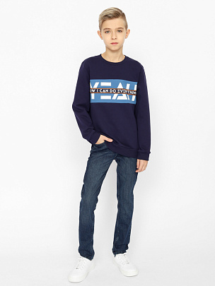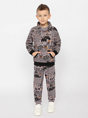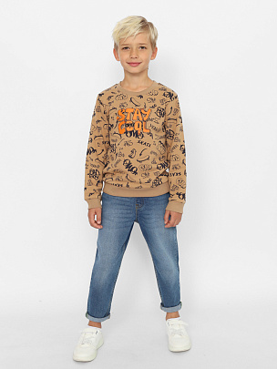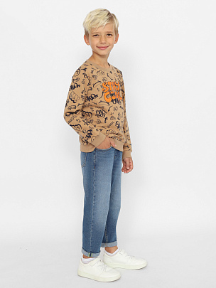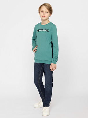 Джемпер для мальчика с длинными рукавами и притачным поясом из полотна с эластаном. Нижние срезы рукавов обработаны притачными манжетами из полотна с эластаном. Горловина круглая, обработана эластичным воротником.