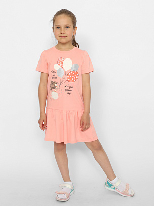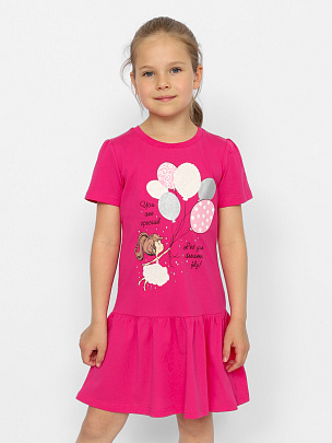 Нарядное платье прилегающего силуэта, с отрезной талией и короткими рукавами. На талии резинка с люрексом. Спереди блестящая шелкография. Верхний слой юбки из сетки с блестящими кружками. Верх платья, нижняя юбка из хлопкового полотна.